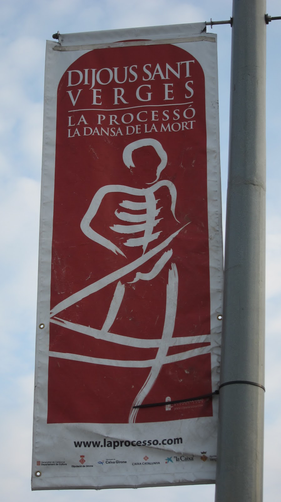 In comparison, the procession at Verges is a theatrical representation, with no actual whipping, just a lot of taunting of Jesus (they used ridicule, satire, and even, gasp, irony!). The church utilized theatre as an evangelizing tool, since masses were done in Latin, and 99.9999% of the population throughout Europe was illiterate and had no education; like Surrey, but without health care. Thus theatrical representations were the TV of the time, and the only opportunity to pass on the stories behind the Christian myths to an unsophisticated audience. The play at Verges is based on a version by fra Antoni de Sant Jeroni, dating from 1773, and is obviously in Catalan, but composed in short rhyming phrases, which makes it very easy to understand, and even remember, very much like Robert Service' "Cremation of Sam McGee." The act of procession has a long history in this tiny town, documented back to 1666, and likely further still.